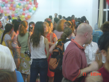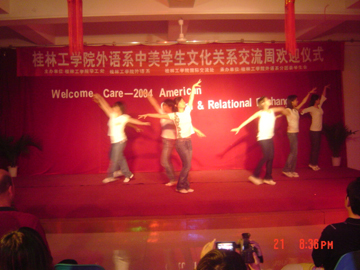 6月21日晚8时,从体育馆附四楼传来阵阵欢声笑语,笑脸在此刻定格,友谊在此刻成为永恒……桂林工学院外语系学生文化关系交流周在此隆重开幕。出席本次开幕仪式的领导有院党委副书记唐善茂老师,院学工部部长梁军老师,院国际交流处处长朱晓媚老师,院团委书记江云青老师,外语系党总支书记张雄老师,外语系党总支副书记范玲老师等。美国访问团一行25人也应邀出席了本次开幕仪式。 首先,院党委副书记唐善茂教授向美国团致了热情洋溢的欢迎词, 对美国访问团的来访表示诚挚地欢迎,并指出此次交流活动的开展具有积极深远的意义,并希望通过这次来访能够加强中美高校的交流和合作,以促进两国的文化交流及学术发展。随后,美国访问团团长Dave也对本次访问活动表示热烈地祝贺,对我院师生的盛情款待表示衷心地感谢,并代表美国访问团向外语系赠送了书籍等礼品,表达了他们对本院师生的深厚情谊。此后,中外双方的精彩表演使本次活动高潮迭起。最后,美国访问团与我院师生合影留念。