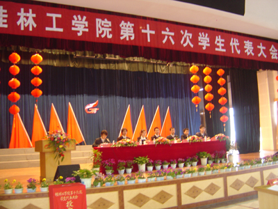 2006年4月15日早上8点半,伴随着庄严而隆重的《中华人民共和国国歌》,桂林工学院第十六次学生代表大会在南校区礼堂隆重召开了。328名代表以及桂林各大高校(广西师范大学、桂林电子科技大学、桂林医学院、桂林航天工业专科学校、桂林陆军学院、桂林师范高等专科学校)的学生会代表参加了本次大会。