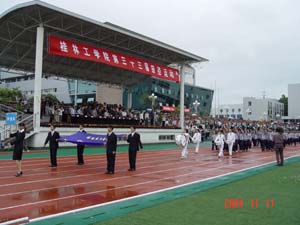 尽管天上飘着丝丝细雨,气温也有点低,但桂工学子对于运动会的热情弥补了这些缺憾。11月11日,学院第三十三届田径运动会在维修一新的运动场按时开幕。院领导阳国亮、赵艳林等出席开幕式,张学洪副书记致开幕词。运动员入场结束后,近百名身着红衣白裙的女同学在绿色人造草坪上为观众奉献了一台精彩的团体操表演,这一久违的景象赢得场外阵阵掌声。