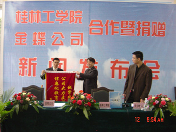 在捐赠仪式中,陈书记代表学院接受金蝶公司捐赠的价值五百万元的K/3 ERP软件系统,与金蝶软件段总监共同为“金蝶企业管理软件桂林工学院培训基地”揭牌,陈书记代表桂工回赠“诚挚感谢金蝶公司大力支持桂林工学院信息化教育建设”锦旗。本次活动将为双方的合作揭开了新的一页。