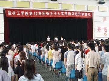 5月14日上午八时,资环系、管理学院等八个分党校的1000余名大学生入党积极分子在学院体育馆礼堂隆重集会,统一举行“桂林工学院第42期积极分子入党前培训班开学典礼”。学院党委书记、党校校长阳国亮同志、学院党委副书记兼纪委书记、党校常务副校长唐善茂同志和党校副校长刘积夫同志出席了会议。党校教员、各分党校校长、副校长、教务长和教务员也参加了此次会议。会议由党校副校长刘积夫同志主持。