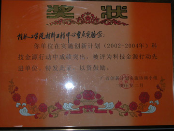 从自治区科技厅下发的《关于表彰奖励第二轮创新计划实施先进单位和先进个人的决定》(桂科发[2005]5号)中获悉,我校材料工程中心重点实验室被评为自治区第二轮创新计划实施先进单位。特此报喜。