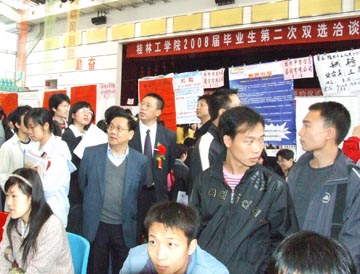 3月22日,学院2008届毕业生第二次“双选会”在体育馆三楼礼堂成功举办。本次双选会共到115 家用人单位,本次洽谈会为学生大约提供了1200 多个就业岗位。据统计,我校毕业生共有 60多人在洽谈会上直接签约,有200 余名学生在洽谈会上达成签约意向。 在双选会进行的同时,学院还面向用人单位代表成功地举办了2008届毕业生推介会,增进了校企双方在培养人才和使用人才方面的沟通和了解,并举行了订单式人才培养合作签字仪式,与广西测绘局等5家单位签订了订单式人才培养合作协议。