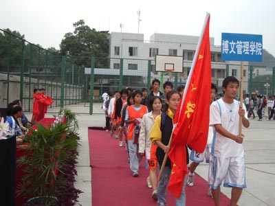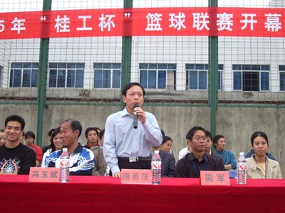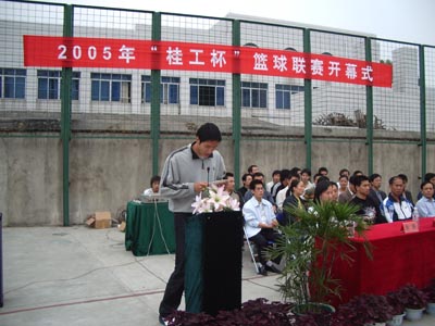 伴随着阵阵掌声,2005年“桂工杯”篮球联赛开幕仪式在主持人的开幕词中拉开了序幕。在仪式上,学院党委唐善茂副书记对比赛寄予了深切希望,他指出:“群众性体育,要有群众基础”,他也对我校篮球的未来进行了展望,“希望我校球队能出现在CUBA的赛场上,这需要时间,但通过努力,我们一定能实现这个目标。”最后,唐善茂副书记也对本次比赛提出了要求,他说:“有这么多的队伍参加是可喜的,希望运动员能把桂工精神良好的风貌展现在篮球场上。”唐善茂副书记的鼓励让所有参赛队伍信心倍增,会场掌声不断。