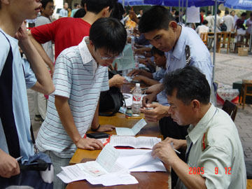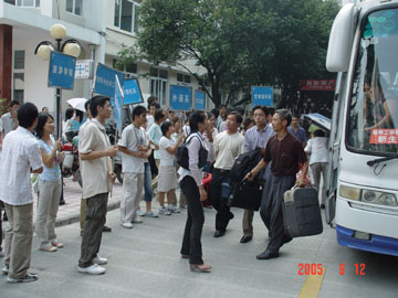 今天是2005级新生开始报到的日子,校园中心广场上,各院系的新生接待站彩旗招展,人头攒动。学院本部今年招生人数为3081人,截止下午5时,已经报到并顺利入住的新生已经达到2096人。其中,土木系招生451人,已到351人;外语系招生122人,已到99人;电计系招生525人,已到338人;高职学院招生424人,已到233人;资环系招生468人,已到257人;管理学院招生460人,已到324人;艺术系招生191人,已到163人;材化系招生275人,已到211人;旅游学院招生165人,已到121人。