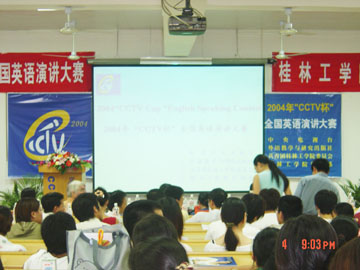 9月4日上午9:00,2004年“CCTV杯”全国英语演讲大赛桂林工学院初赛在9101教室顺利举行。参加大赛的20名选手围绕着“Man and Internet”这个主题展开了精彩的演讲,外语系的吴婕同学和旅游学院的俞悦同学分别以8.7分和8.66分脱颖而出,共同获得本次大赛的个人一等奖,而团体一等奖则被旅游学院摘取。