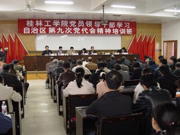 学院党委书记黎志逘为培训班作了学习贯彻第九次党代会精神辅导报告。黎书记的辅导报告分为四个部分: 一是自治区第九次党代会所提出的目标和任务。黎书记指出,刘奇葆书记的报告明确了广西今后五年乃至更长时间的发展目标与任务。报告全面体现了以邓小平理论和“三个代表”重要思想为指导,体现了科学发展观,体现了以人为本,体现了以经济建设为中心。报告提出的目标和任务是:加快富民兴桂新跨越步伐和全面建设小康社会进程,努力建设富裕文明和谐新广西。这个目标振民心、合民意,得到了全区人民的拥护。 二是自治区第九次党代会提出的目标和任务的意义。建设富裕文明和谐新广西,是我区全面贯彻科学发展观,落实构建社会主义和谐社会重大战略任务的具体体现,是我区全面建设小康社会的必然要求,是我区适应国际国内形势发展的客观需要。 三是如何实现自治区第九次党代会提出的目标。要顺利实现这个目标,我们必须集中力量,深入实施富裕广西、文化广西、生态广西、平安广西建设等决策部署,努力形成经济建设、政治建设、文化建设和社会建设统筹推进的良好局面。需要“五年打基础,十年上水平”,努力推动经济社会发展迈上新台阶。 四是我校贯彻落实自治区第九次党代会精神应该抓好哪些工作。黎书记要求,要紧紧围绕大会提出的目标和任务,认真思考和落实以下四个问题:一、加快新校区建设。目前,新校区一期征地任务已经全部完成。二期征地工作要尽快启动。黎书记要求新校区建设指挥部要全力以赴做好新校区建设各项工作,全院各单位、各部门要全力支持新校区的建设。二、全面启动“两申”工作。他要求全校上下要统一思想,围绕“两申”做好工作。要尽快落实工作班子,全面启动各项工作。当前,要把实现更名大学作为实现“两申”目标的重点来抓紧抓好。三、提高教学质量。要把提高教学质量作为学校的中心任务来抓,全校上下都要高度重视这一工作。四、抓好管理工作。管理工作涉及到方方面面。良好的管理是形成一个强有力的团队必不可少的条件,要不断探索和完善行之有效的管理模式和管理制度,形成高效运行的管理机制,保障学校各方面工作健康有序快速地向前发展。