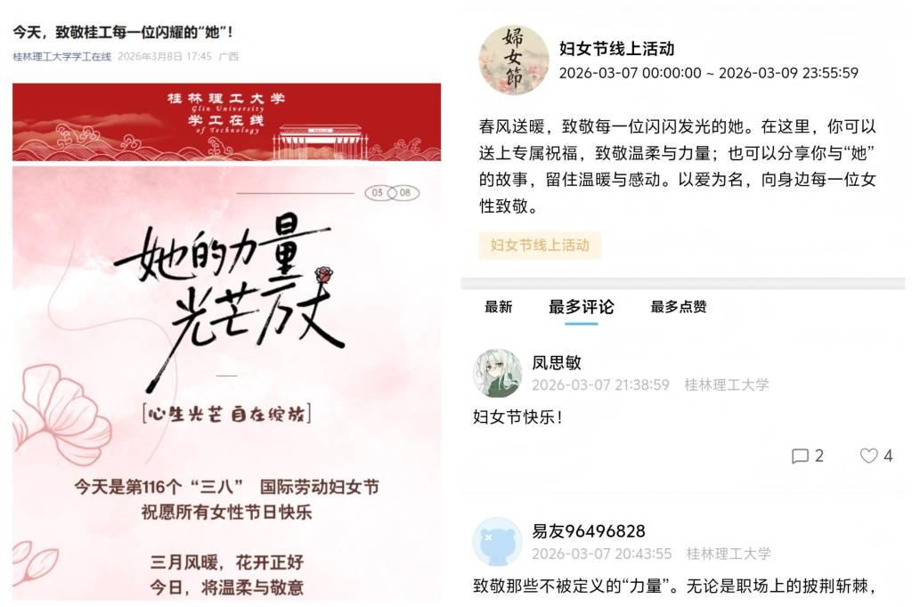 学生工作部(处)依托微信公众号、易班线上平台,打造覆盖全校的节日祝福与互动阵地。通过“桂林理工大学学工在线”微信公众号发布妇女节主题长图推文,聚焦校园女教师、女辅导员、后勤女职工、女学生等不同女性群体,生动展现其在教学科研、学生管理、后勤服务、求知成长中的风采与担当,推文引发校内师生广泛关注和积极转发。同时在易班平台开展线上互动活动,设置评论送祝福、分享与“她”的故事两大板块,吸引3000余名学生踊跃参与,大家在留言中传递美好祝愿、分享暖心故事,在互动中深化对女性力量的认知,激发对身边女性的感恩之情。