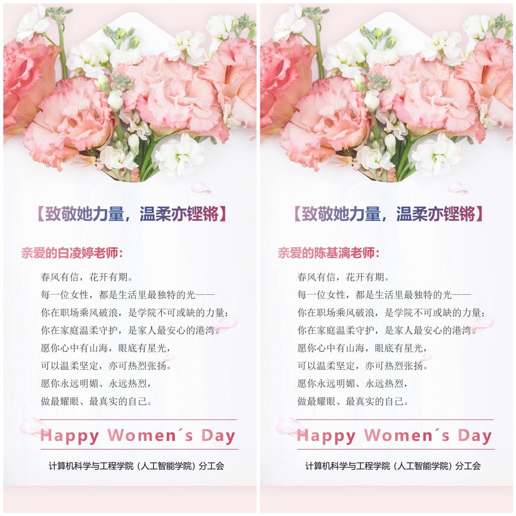 计算机科学与工程学院(人工智能学院)分工会精心组织系列暖心慰问活动,把温暖与敬意送到每一位女教职工心坎上。3月8日,学院为每位女教职工送上写满真挚祝福的节日贺卡,“每一位女性,都是生活里最独特的光”等暖心话语,饱含对女教职工在教书育人、科研攻关、管理服务等岗位默默奉献的深深敬意。3月9日,学院分工会联合学生会开展“鲜花献恩师”活动,学生代表手捧鲜花、带着真诚问候将祝福送到女老师手中,突如其来的惊喜让老师们倍感温暖。学院还将举办花艺手工活动,邀请女教职工在花艺创作中放松身心、遇见美好。