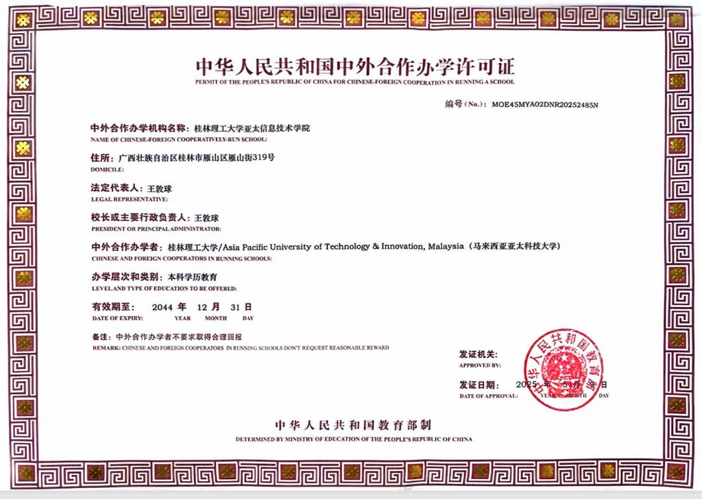 2025年与马来西亚亚太科技大学合作举办“桂林理工大学亚太信息技术学院”获教育部批准