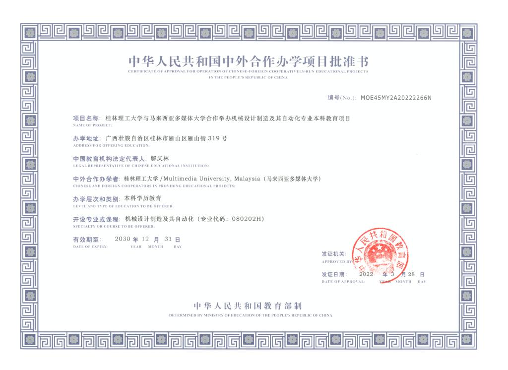 2022年与马来西亚多媒体大学合作举办机械专业本科“4+0”项目获教育部批准