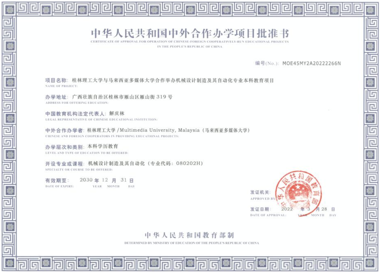 2022年与马来西亚多媒体大学合作举办机械专业本科“4+0”项目获教育部批准