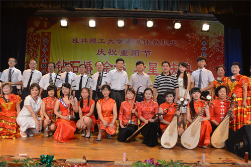 10月12日上午,在我国的传统节日重阳节来临之际,我校在南校区礼堂隆重举行首届“重阳节钻石婚、金婚、寿星”庆典活动。我校7对钻石婚夫妇、49对金婚夫妇以及5名寿星代表和离退休老同志近400人欢聚一堂,共同庆祝重阳佳节。学校校长解庆林,党委副书记王赣华以及相关职能部门领导和各二级学院相关负责人参加了庆典活动。 庆典活动在电子烟花和小学生踩气球的欢呼声中拉开序幕。原学校党委书记柳林等寿星代表和钻石婚、金婚夫妇代表在热烈的掌声中分别登台入场。学校校长解庆林,党委副书记王赣华代表学校党委和行政给寿星代表和钻石婚、金婚夫妇代表送上了鲜花和祝福。 在庆典活动上,解庆林校长发表了热情洋溢的致辞。他代表学校党委行政和全校师生员工,向所有老同志致以节日的问候和诚挚的祝福!对寿星、钻石婚和金婚伉俪们致以崇高的敬意和衷心的祝福!解校长深情地说道:“学校今天的蓬勃发展凝结着老前辈们的青春汗水,我们永远不会忘记老同志们做出的不可磨灭的贡献,希望各位老同志一如既往地关心支持学校发展,多提宝贵意见,提升学校内涵建设,提高学校教育教学质量,促进学校各项事业的发展,为早日实现‘特色鲜明的高水平理工大学’的奋斗目标奠定坚实基础”。最后,解校长祝愿广大老同志福如东海,寿比南山! 庆典活动后,学校还举行了慰问演出。学校大学生艺术团带来的舞蹈《掀起你的盖头来》展现了学校青年学子朝气蓬勃的精神面貌,优美的舞姿和美妙的动作赢得了现场阵阵掌声;金婚代表柳淮之、谢韫夫妇的诗朗诵《庆金婚》表达了他们携子之手、与子偕老、相濡以沫的深情厚谊,也表达了他们作为1956年来校的第一批开发建设者对学校的一往情深;离退休教职工黄英娣、谢丽婵、苏采芳等的歌伴舞《最浪漫的事》,唱出了离退休老同志幸福的晚年生活;附属小学学生的舞蹈《中国结》演绎了对美好生活的向往,动感十足的韵律与优美的舞姿,表达了对老同志的无比敬仰,表达了他们对老同志的深深祝福;桂林民乐艺术家慰问演出团带来精彩的唢呐独奏、京剧表演、二胡演奏以及男生独唱等精彩的节目将慰问演出不断推向高潮;最后,慰问演出在器乐合奏《喜洋洋》欢快的乐曲声中落下帷幕。 此次活动弘扬了中华民族尊老、敬老、爱老的传统美德,为校园文明和谐增添了正能量。