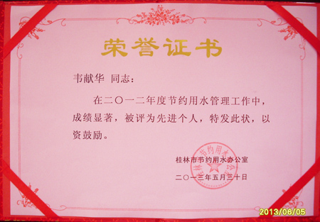 我校获得“2012年度桂林市节约用水先进单位”荣誉称号