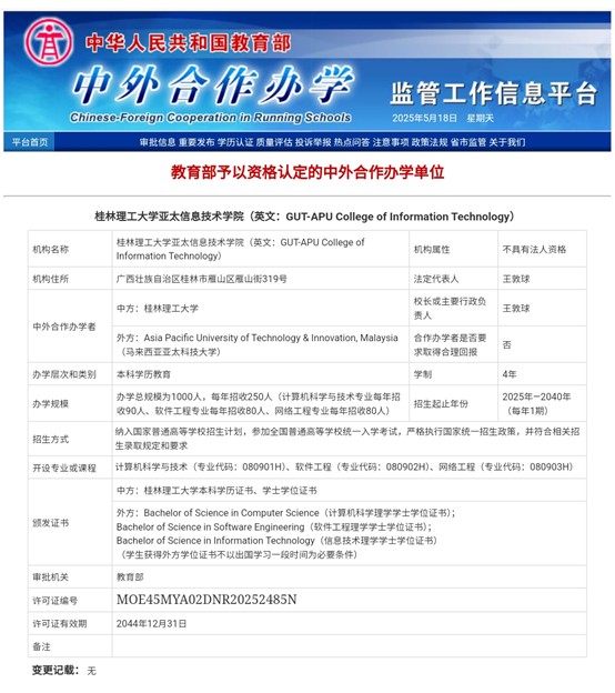 亚太学院由我校与马来西亚亚太科技大学合作举办,是广西首个与东盟高校举办的中外合作办学机构,也是目前广西唯一聚焦培养高素质、国际化、应用型IT人才的中外合作办学机构。亚太学院开设计算机科学与技术、软件工程和网络工程等3个本科专业,采用“4+0双证”培养模式,引进亚太科技大学优质教育教学资源,实现强强联合,达到要求的毕业生可获得我校颁发的毕业证、学位证和亚太科技大学的学位证。