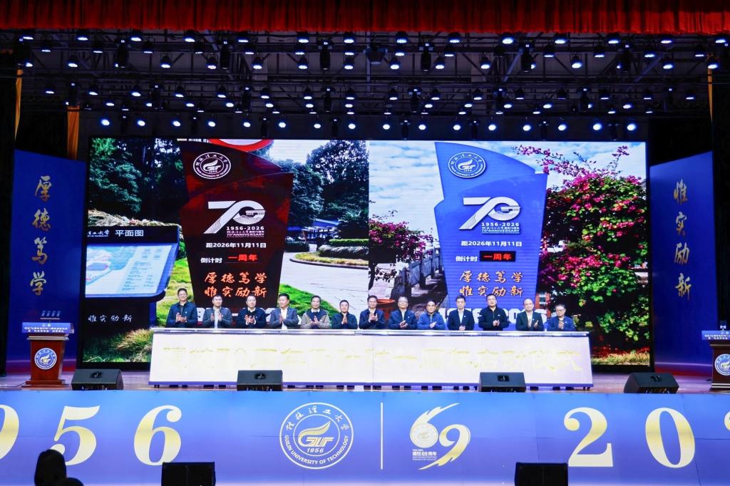 伴随着温情脉脉的视频《妈妈的生日礼物》,与会人员共同回顾了学校一年来的发展足迹与感人瞬间。随后,全体校领导、校友代表共同上台推杆,正式启动70周年校庆倒计时一周年。启动仪式后,学校党委副书记、校长王敦球宣读《桂林理工大学70周年校庆一号公告》,向海内外校友和社会各界发出诚挚邀请,相约2026年共庆母校七十华诞。紧接着,校旗传递仪式隆重举行,王敦球将校旗郑重授予北京校友会会长刘生发,标志着校旗全球传递活动正式从首都北京出发。未来一年里,这面承载着“桂工精神”的校旗将传递世界各地的校友组织,最终于70周年校庆前夕回到母校。大会还正式发布了70周年校庆标识。