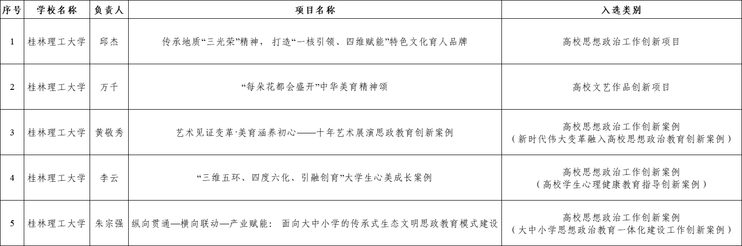 近日,自治区教育厅公布全区高校思想政治工作改革创新经验推广项目入选名单,我校报送的《传承地质“三光荣”精神,打造“一核引领、四维赋能”特色文化育人品牌》《“每朵花都会盛开”中华美育精神颂》《艺术见证变革·美育涵养初心——十年艺术展演思政教育创新案例》《“三维五环、四度六化、引融创育”大学生心美成长案例》《纵向贯通—横向联动—产业赋能:面向大中小学的传承式生态文明思政教育模式建设》等2个项目、3个案例成功入选。