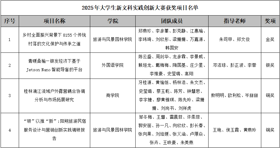 近日,由全国新文科教育研究中心主办,西安交通大学、山东大学承办的第二届大学生新文科实践创新大赛决赛现场赛在西安举行。我校参赛项目《乡村全面振兴背景下8155个传统村落的文化保护与传承之道》荣获金奖,《青暖桑榆——银发经济下基于Jetson Nano的智能导盲平台》荣获银奖,《桂林漓江流域户外露营耦合协调分析与市场拓展研究》和《“研”以推“新”:阳朔旅游民宿服务设计与营销创新实践调研报告》荣获铜奖,创下我校在该赛事中的历史最佳成绩。