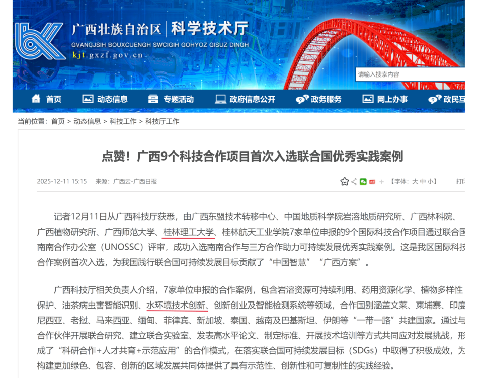 近日,从广西科技厅获悉,由广西7家单位申报的9个国际科技合作项目通过联合国南南合作办公室(UNOSSC)评审,成功入选南南合作与三方合作助力可持续发展优秀实践案例。我校环境科学与工程学院推荐的国际科技合作项目“中国-马来西亚水环境技术创新中心”成功入选。这是我区国际科技合作案例首次入选,为我国践行联合国可持续发展目标贡献了“中国智慧”“广西方案”。