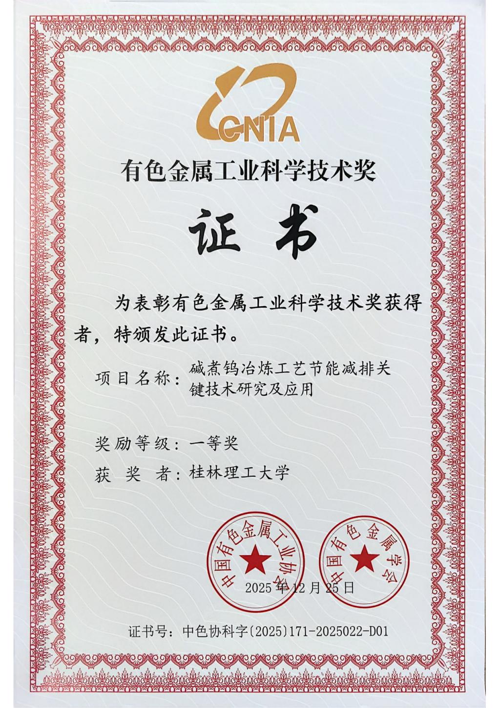 近日,中国有色金属工业协会和中国有色金属学会公布2025年中国有色金属工业科学技术奖获奖名单,我校李义兵教授团队完成的碱煮钨冶炼工艺节能减排关键技术研究及应用项目获评一等奖,这标志着行业对我校在金属钨冶炼领域科技创新成果的高度认可。