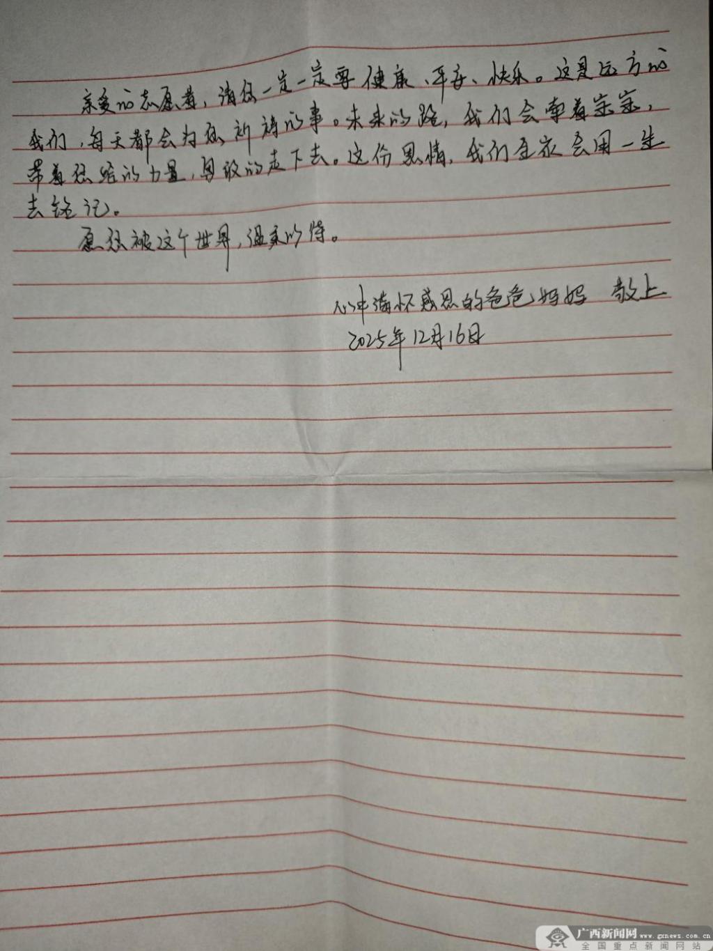 当被问及想对受助者说的话时,覃赫想了想,认真地说:“好好享受人生吧。希望这份来自陌生人的温暖,能让你感受到世界的美好。也让我们将这份爱心传递下去,温暖更多的人。”