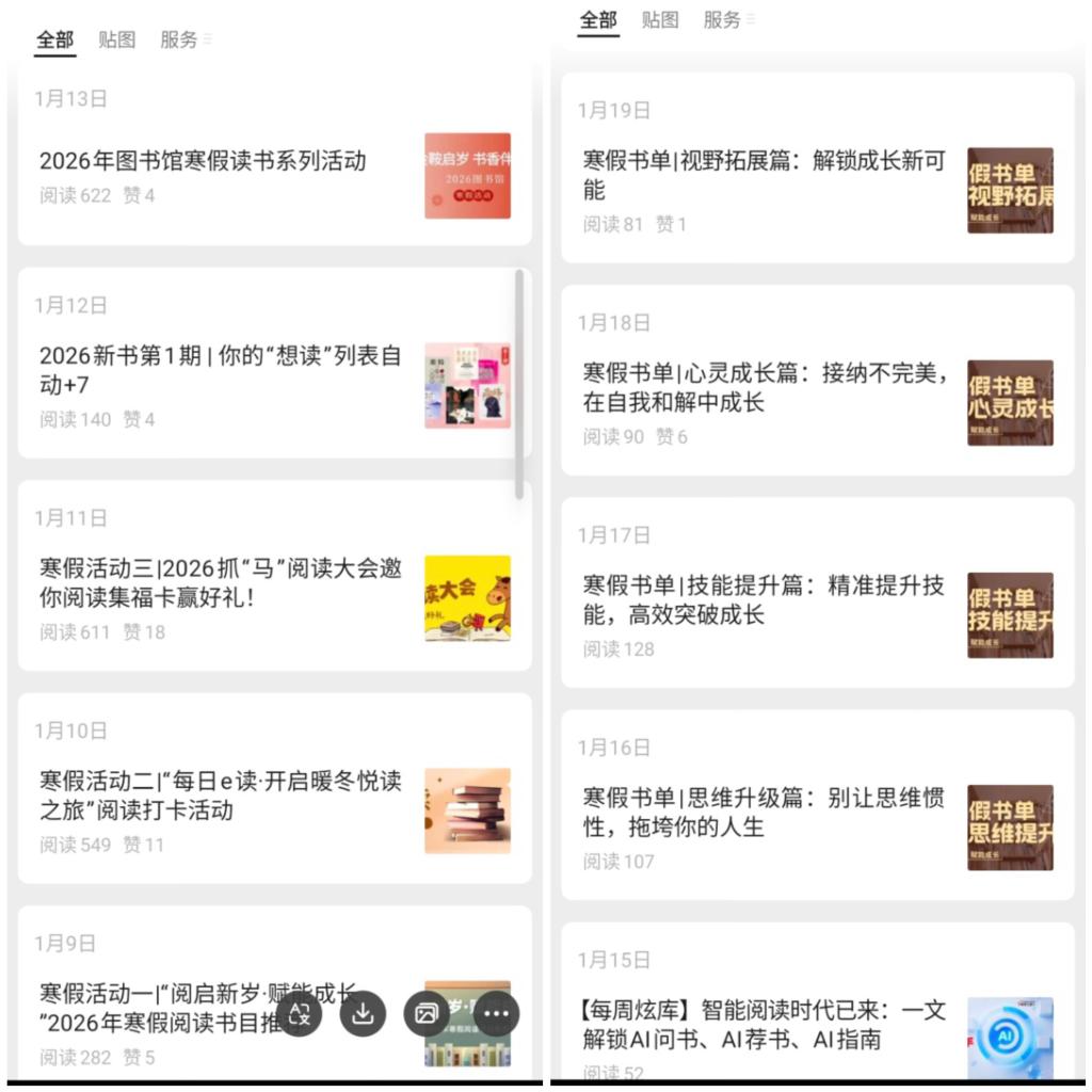 图书馆组织开展“金鞍启岁·书香伴春”寒假读书系列活动,推出好书推荐、阅读打卡、抓‘马’阅读大会等特色活动,同步开展“智启乡梓·AI传情”返乡学子AI科普行动;完成畅想之星8241种、超星汇雅74936种电子图书本地镜像部署,发布校外文献资源访问指南,全方位保障师生假期文献资源使用需求,让学子在书香中充实假期生活。