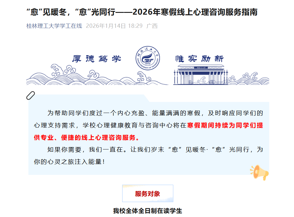 开通2026年寒假线上心理咨询服务