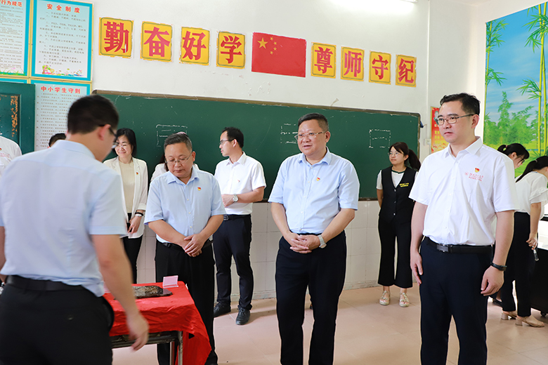 邓军一行首先来到学校关工委在灌阳县红军小学举行的“老少颂党恩、喜迎二十大”关爱小学生活动现场,对老教授、老同志认真落实学校党委确定的“文化帮扶行动”,在时代舞台上传承和弘扬社会主义核心价值观,身体力行引领下一代听党话、感党恩、跟党走的实际行动表示由衷赞扬。饶有兴致地观看了老同志们精心准备的党史国史漫画展、非遗文化技艺传承展演,向小学生们捐赠了书籍和文体用品,并与老同志和小学生代表一同为学校“关心下一代教育基地——灌阳工作站”揭牌。在学校定点帮扶顺溪村顺溪小学援建的“移动地质博物馆”现场,邓军一行与学校地质博物馆工作人员、小学生一同参观了矿物标本展陈,现场观摩小学生利用矿物染料作画,勉励小学生从小热爱祖国,热爱科学,积极探索科学奥妙,立志成长成才。
