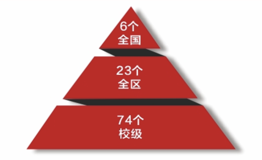 构建6个全国、23个全区和74个校级的“三级联动”党建“双创”项目矩阵