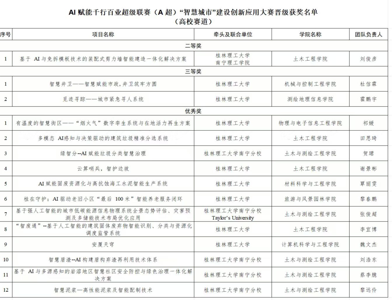 近日,由自治区住房和城乡建设厅主办的AI赋能千行百业超级联赛(A超)“智慧城市”建设创新应用大赛高校赛道获奖名单正式公布,我校参赛学子凭借扎实的专业功底与出色的创新能力脱颖而出,斩获二等奖1项、三等奖2项、优秀奖12项,以15项获奖总数位列广西高校第二名。