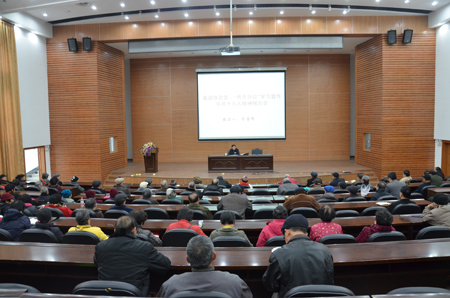 12月12日上午,离退休党委、“两老协会”邀请学校原党委副书记、“两老协会”副会长李善辉教授作党的十八大精神辅导报告。离退休党委书记徐和飞,离退休工作副处长罗彩云、聂艳华,“两老协会”会长等出席报告会。离退休党员、“两老协会”会员参加了报告会。报告会由离退处党委书记徐和飞主持。 李善辉教授结合自己的亲身经历、感悟和思考,做了题为《高举旗帜 、努力奋斗》的报告。他简要回顾了党的十八大举行的盛况,围绕深刻认识党的十八大主题和伟大意义,从成就与总结、目标与任务、保障条件和党的建设四个方面进行阐述。在讲解过程中,李善辉教授利用大量数据和具体例子,对党的十八大精神进行了深入浅出、通俗易懂的讲解,使在场听众系统地理解了党的十八大报告的精神内涵。 报告会后,徐和飞书记代表学校离退休党委和“两老协会”对李善辉教授所做的精彩报告表示衷心感谢,并再次强调,学习宣传贯彻党的十八大精神是我们今后一个时期首要的政治任务。他要求离退休党委和“两老协会”会员一是要在深入学习、深刻领会上下功夫;二是要在深入宣讲、广泛宣传上下功夫,三是各支部和“两老协会”要联系实际,精心组织学习讨论,用党的十八大精神武装头脑,让党的十八大精神入脑入心。