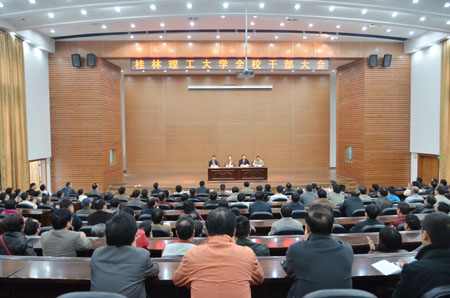 11月12日上午,我校在图书馆报告厅召开干部大会。自治区高校工委副书记莫锦荣,自治区党委组织部干部五处副处长谭泽松出席会议。全体校领导,全校处级干部和正高职称人员参加大会。 会上,莫锦荣副书记宣布了自治区党委、政府对我校党政领导班子调整任命的决定:任命张学洪同志为桂林理工大学党委书记,解庆林同志为桂林理工大学校长、党委副书记。莫锦荣在讲话中指出,此次桂林理工大学党委书记和校长的任命是自治区从桂林理工大学教育事业发展和领导班子建设的实际出发,经过反复酝酿、慎重研究决定的,充分体现了自治区对桂林理工大学领导班子建设的关心和重视。他对学校领导班子带领全体师生员工不断开创桂林理工大学科学发展的新局面给予了充分肯定。他希望我校领导班子能够带领桂林理工大学坚持“育人为本、质量立校、人才强校”的办学理念,积极推进教学改革,努力开拓创新,主动服务广西经济社会发展,以特色、优势学科引领学校发展。 解庆林校长在就职感言中感谢组织的关心、照顾和安排,表示此次回到母校,心情十分激动,一定会尽快转变角色,发奋学习,努力工作,不断开拓创新,坚决贯彻执行党委领导下的校长负责制,与班子成员团结协作,不辜负组织的重托和同志们的信任。 最后,张学洪书记代表学校党委和领导班子感谢自治区党委、政府对学校的重视和关怀,感谢上级领导和全校师生员工对自己的信任和支持。作为桂林理工大学党委书记,他深感责任重大、使命崇高,他表示将不负众望,努力工作,团结合作,敬业奉献,开拓创新,和广大师生员工一起发扬“桂工精神”,为建设特色鲜明的高水平理工大学而努力奋斗!