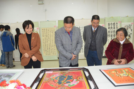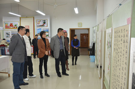 张学洪校长(左四)、陈贵英副校长(左三)参观书画作品(一)