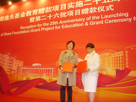 2012年10月19日,陈贵英副校长代表学校出席了由教育部举办的邵逸夫基金教育赠款仪式。 由我校申请,经专家评审和教育部推荐,我校雁山校区1#教学楼(逸夫教学楼)建设项目得到了邵逸夫基金的认可,并列入邵逸夫基金第26批捐赠项目予以资助,资助金额为500万元港币。 邵逸夫基金是由香港著名实业家邵逸夫先生设立的,是当前海内外爱国人士通过教育部持续时间最长、赠款金额最大,建设项目最多的教育赠款项目。自1985年来,连续为内地教育事业发展注入善款,累计赠款金额已超过45亿港币,为内地教育事业的发展做出了有益的补充和宝贵的贡献。今年是邵逸夫基金赠款项目实施25周年,在举行第26批项目赠款仪式的同时,举办了邵逸夫基金教育赠款项目实施25周年庆祝酒会,陈贵英副校长代表学校出席了庆祝酒会。