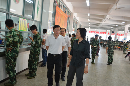 莫锦荣副书记(左)在陈贵英副校长(右)的陪同下检查学生食堂情况