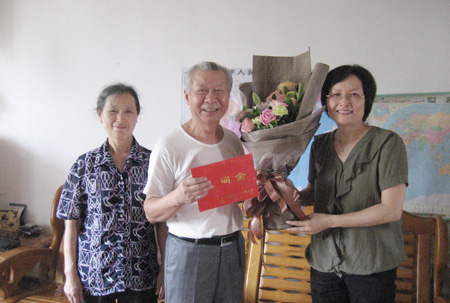 陈贵英副校长(右)慰问退休教师欧阳成甫教授
