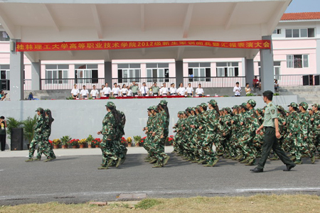 9月28日上午,高职学院2012级新生军训阅兵暨汇报表演大会在空港校区足球场隆重举行。学校副校长刘宝臣,扶绥县武装部副部长张国新,崇左军分区上尉刘燕清及该院党政领导出席阅兵暨汇报表演大会并在主席台就座。该院各部门、各单位负责人,各系辅导员以及2012级全体新生参加。 阅兵式在激昂的人民解放军进行曲中拉开帷幕。副校长刘宝臣检阅了该院2012级受阅的22个新生连队。随后,分列式队伍伴着雄壮的分列式进行曲依次走过主席台前接受各位领导的检阅。同学们队伍整齐、口号嘹亮、气势雄壮,展现出良好的军事技能和干练的作风,赢得检阅领导的好评和在场观众的阵阵掌声。在接下来的军事项目表演中,同学们分别表演了男子军体拳、女子队列操等4个项目。他们队形整齐、变换有序、协调一致,展现了当代大学生蓬勃的朝气。 副校长刘宝臣在总结讲话中指出,2012级新生在阅兵表演中展现了高职学院学子良好的精神风貌,表明今年的军训工作已经取得了圆满成功。他希望同学们将军训中培养的好思想、好作风带到今后的学习和生活中去;希望大家弘扬艰苦创业、敬业奉献、团结协作、开拓创新的桂工精神,做一个理想远大、热爱祖国、追求真理、勇于创新、德才兼备、全面发展的人,努力为推进学校全面建设和发展,为祖国明天更辉煌而奋发图强。 崇左军分区上尉刘燕清鼓励高职学院2012级新生继续发扬吃苦耐劳精神,努力继承军人品格,发扬军人作风,争当新时代的优秀大学生。随后,该院党委常务副书记梁冬松宣布嘉奖令,对军训期间涌现出的优秀教官、优秀指导员和学生军训先进个人进行了表彰。 最后,高职学院2012级新生军训阅兵暨汇报表演大会在嘹亮的军歌声中圆满落幕。