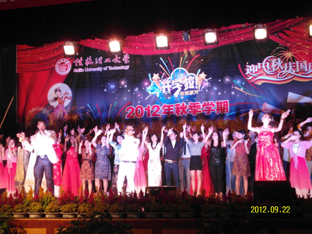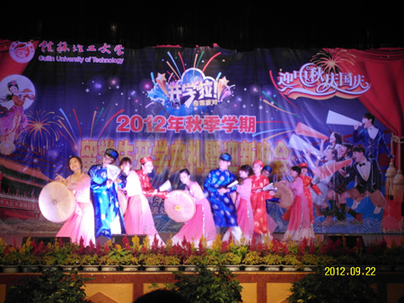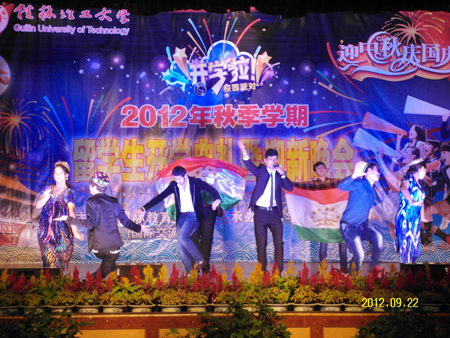 9月22日晚上,我校2012年秋季学期留学生开学典礼暨迎新晚会在屏风校区南校区礼堂隆重举行,周国清副校长及学校相关部门负责人出席了本次活动。 周国清副校长发表了热情洋溢的讲话,他代表学校对来自世界各地的留学生们表示热烈的欢迎!随后,周副校长向留学生们介绍了学校的基本情况。他说,近年来,我校的国际合作与交流和留学生教育取得了长足的进步,目前已有来自39个国家的400余名留学生在我校学习。他殷切希望留学生们能尽快克服文化和语言的差异和障碍,努力学习,珍惜友谊,积极融入到桂工这一温暖的大家庭中来,搭建好中外友谊之桥,争做传播中外友谊的使者。 “中亚的雄浑、南亚的婉约、欧美的热情、非洲的奔放”使开学典礼与迎新晚会现场充满了欢声笑语,节目高潮迭起,异彩纷呈。留学生们在舞台上展示了各自的民族特色和异域风情,展现了青春与活力,为桂工校园增添了多元的文化色彩。