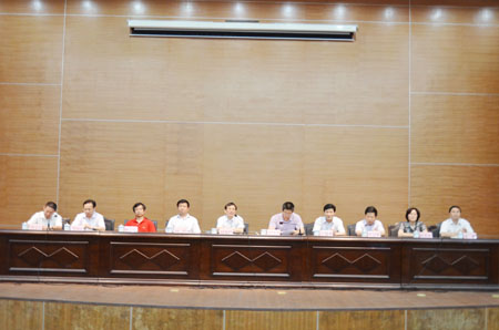 学校党委书记赵艳林(左五),校长张学洪(右五),党委副书记、纪委书记赵君(左四),党委副书记王赣华(右四),副校长陈学军(左三)、吴志强(右三),周国清(左二),陈贵英(右二),刘宝臣(左一),张鹏调研员(右一)出席会议