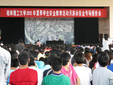 为扎实推进我校夏季学生安全教育月工作,建立健全安全防范工作机制,强化学生守纪自律意识和安全保护意识,切实提高学生防范避险和应急处置能力,我校于4月9日至4月12日分别在屏风、雁山两校区举行了4场题为“珍爱生命、预防溺水”的游泳安全专场报告会,本次报告的主讲人为桂林市公安局漓江分局林敏副局长。学校党委王赣华副书记全程出席报告会,屏风、雁山两校区1万多名学生和各学院学工人员共同听取了报告。 林敏副局长对享有“黄金水道”之美称的桂林母亲河——漓江非常了解,对溺水事故的处理经验也非常丰富。报告会上,林副局长介绍了自2009年底漓江分局成立以来,漓江市区段水域发生的溺水事故,并结合个别大学生溺水死亡的详细案例进行剖析,告诫大学生们不要到无安全保障措施水域游泳。他还根据该局常年工作中遇到的实际情况,详细地介绍了漓江地区危险水域的具体情况,以及游泳过程中应注意的安全事项和溺水事故的现场急救方法。最后,他希望广大同学要热爱生命、珍惜生命,让生命的价值在造福社会、服务大众的实践中得到充分体现! 此次报告会让师生们认识到去无安全保障措施和陌生水域的江河湖泊游泳的危险性,也帮助师生们掌握了一些防溺水的知识和技巧,对提高同学们的安全意识和自我救护能力,有效避免溺水事故的发生,营造安全和谐校园环境起到了积极促进作用。