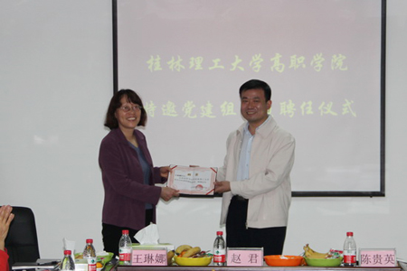 3月30日下午,高职学院在空港校区办公楼204会议室举行特邀党建组织员聘任仪式,原高职学院党委书记王琳娜同志被聘为该院特邀党建组织员。校党委副书记、纪委书记赵君,校党委组织部部长陈贵英等出席聘任仪式。该院领导班子成员及中层干部代表参加聘任仪式。校党委组织部陈贵英部长主持聘任仪式。 聘任仪式上,校党委副书记、纪委书记赵君为王琳娜同志颁发特邀党建组织员聘任书,并在讲话中对特邀党建组织员提出具体要求:一是要充分认识做好特邀党建组织员的重要意义,在保证身心健康的前提下,力所能及地开展有关工作;二是继续关心学校、学院发展,充分发挥离退休同志在党建工作中的优势和作用,不断开创学院党建工作新局面。