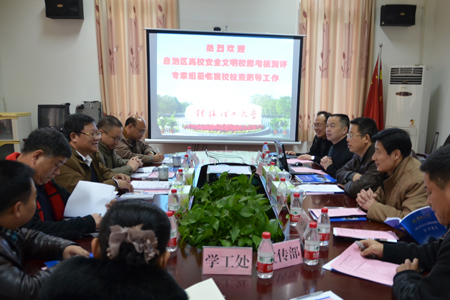12月25日下午,以广西大学党委副书记邓军为组长的全区高校安全文明校园考评专家组一行5人来我校考核测评。 张学洪书记、王赣华副书记、肖岳峰副校长等校领导及人事处、党(校)办、保卫处、宣传部、学工处、工会、团委、教务处、科技处、现代教育技术中心、财务处、后勤集团、国际教育学院、校医院等相关负责人陪同考评。 在汇报会上,张学洪书记对专家组的检查指导表示热烈欢迎,并简要介绍了我校2012年安全文明校园建设工作的总体情况。 肖岳峰副校长从学校基本概况、制度建设、校园安全、校园稳定、校园环境、校园文化、文化创建、年度状况、工作特色等方面汇报了我校2012年安全文明校园建设工作的具体情况。 随后,专家组查阅了我校安全文明校园工作相关资料,对校园环境及图书馆、材料科学与工程学院实验室、学生宿舍、学校心理咨询中心等处进行了实地考察,与我校教职工、学生代表进行了座谈,并在师生中进行了问卷抽样调查,以多种方式对我校的安全文明校园建设情况进行考评。 通过实地考察,专家组对我校安全文明校园建设工作给予了充分肯定:一是学校领导高度重视,体制机制完善,工作保障有力,“人防、物防、技防” 三防体系到位;二是认真抓好落实,针对2011年度安全文明建设存在的问题进行了认真整改,达到了以评促建的效果;三是维稳工作进一步加强,校园总体安全,校园舆论引导正确,管理到位,突发事件处理及时有效;四是校园环境治理与周边环境治理工作也取得了良好的成绩,校警联动机制进一步增强;五是校园文化场地、设施齐全,文化活动丰富多彩;六是文明创建工作深入推进,心理健康教育比较具体等等。同时,专家组对我校进一步加强和改进安全文明校园建设工作提出了意见和建议。 张学洪书记代表学校对专家组严谨的评估及提出的良好建议表示感谢,指出我校将以此次安全文明校园考核测评为契机,发扬优点,克服不足,进一步提高认识,强化安全责任意识,努力做好各项工作,使学校安全文明校园建设工作再上一个新的台阶。