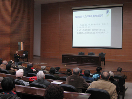 2012年11月29日下午4点,学校在图书馆报告厅召开规范退休人员津贴补贴工作情况说明会。陈贵英副校长会前听取了人事处、离退处有关工作汇报并亲临会议现场指导,人事处处长华桂林同志就规范退休人员津贴补贴的相关政策和我校开展工作情况做了解释和说明,一百多名退休人员参加了说明会。