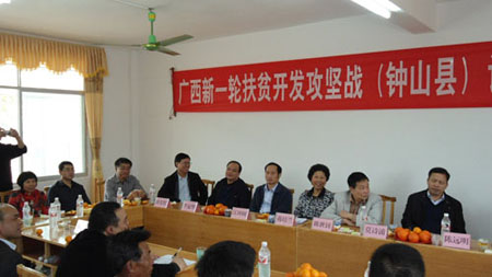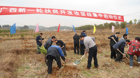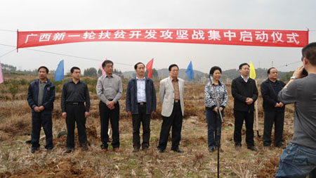 日前,广西新一轮扶贫开发攻坚战集中启动仪式钟山分会场在贺州市钟山县回龙镇龙福村举行,我校校长助理顾炳根率党委组织部相关负责人出席了启动仪式。自治区政协副主席蒋培兰在启动仪式上宣布钟山新一轮扶贫开发攻坚战启动,贺州市委副书记莫诗浦、贺州市政协副主席李冠华、自治区邮政公司、广西地矿局相关领导及钟山县四家班子领导等共同参加了启动仪式。启动仪式由钟山县委书记陈远明主持。 蒋培兰在启动仪式上要求,各级党委、政府和广大党员干部要进一步增强做好扶贫开发工作的责任感和使命感,奋发有为,坚决打好新一轮扶贫开发攻坚战。在随后的贡柑果苗捐赠仪式上,蒋培兰与区、市、县领导分别给村民们发放了果苗并一同拿起铁揪为钟山千亩贡柑种植基地种下了贡柑果苗。 为了切实推动我校广大党员干部深入基层,为民服务,扶贫攻坚,创先争优,推动富民强桂新跨越,2011年我校派出了侯辉同志在贺州市钟山县里太村担任新农村建设指导员,力求通过政策、思想、资金、物资、技术、信息等方面的援助帮助结对贫困村改善生活条件,改善民生、加快发展,实现扶贫解困明显推进、乡村困境明显改善、干部作风明显转变、基层组织明显加强的目标。据悉,今年我校将按照自治区党委的工作部署,继续选派3名同志赴贺州担任新农村建设指导员和贫困村党组织第一书记。