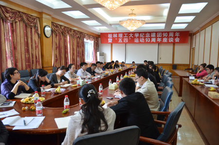 “青年者,人生之王,人生之春,人生之华也”。5月4日上午,我校在教八楼会议室隆重举行建团90周年暨“五四”运动93周年座谈会。王赣华副书记出席会议并发表重要讲话,代表学校党委向全校青年、全体专职团干致以节日的问候并提出殷切希望。各学院专职团干及青年学生代表参加座谈会。座谈会由校团委书记辛立章主持。 座谈会上,青年代表们结合学习、工作实际,畅谈了“五四”运动和中国共产主义青年团的光辉历史,表示要继承和发扬“五四”精神、“桂工精神”,立足岗位,创先争优,开创性地做好团的各项工作,不负时代重托,勇担历史责任,为学校的建设发展和中华民族的伟大复兴作出贡献。 王赣华副书记在认真听取青年代表的发言后作了讲话。他首先代表学校党委、行政向全校广大青年致以节日的问候。他指出, “五四”运动是一批爱国青年在民族危亡的历史时刻勇担时代责任的具体体现,在新的历史时期,我们既面临着难得的发展机遇,也会遇到不少的问题与挑战,广大团员青年和各级共青团组织,要继承和弘扬“五四”精神,高举“爱国、进步、民主、科学”的伟大旗帜,为学校的发展和国家的不断进步而不懈努力。 座谈会上,王赣华副书记对广大青年朋友提出了三个“落到实处”: 青年朋友要有历史责任感、勇于担当,把继承和弘扬“五四”精神落到实处;青年朋友要勤奋学习、刻苦钻研,把掌握科学文化知识和专业技能落到实处;广大团学干部要认真抓好团的各项工作,加强对广大团员以“桂工精神”为主的校史校情教育,把团的建设落到实处,为实现中华民族伟大复兴和建设特色鲜明的高水平理工大学创造壮美的青春业绩。