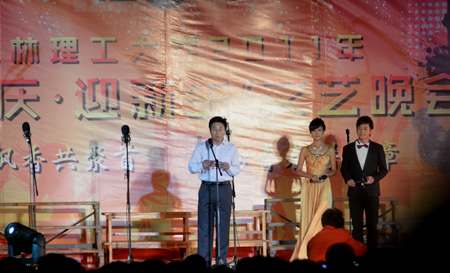 齐欢聚,共起航。恰逢国庆来临之际,为迎接2011级新生到来,一场以“丹桂飘香共聚首,激扬青春谱华章”为主题的2011年迎新生文艺晚会在学校雁山校区大操场隆重举行。学校校长张学洪,党委副书记王赣华,副校长陈学军、吴志强出席并观看晚会,党(校)办,党委宣传部、统战部,学工处(部),校团委,武装部及各学院相关负责人与全体新生一同观看了演出。 王赣华副书记为晚会致辞。他首先代表学校党委、行政向2011级新同学的到来表示热烈的欢迎,希望同学们在这喜气洋洋的夜晚感受到桂工大家庭的温暖,把桂工当成自已谱写青春新华章的起点,勤奋学习,早日报效祖国。 整场晚会形式多样,精彩纷呈。一曲《国家》拉开晚会的帷幕,艺术团合唱队的同学们经过了广西大学生艺术展演的洗礼,表现得越发成熟和自信,他们雄壮浑厚的歌声抒发了满腔的爱国情怀,为庆祝祖国62周年华诞送上桂工学子的祝福;紧接着舞蹈《踩云彩》用灵动优雅的舞姿展现出彩云之南的彝族人民的幸福生活,带动了新生们对美好未来的憧憬;古筝独奏《战台风》如高山流水结合书画协会同学挥笔方遒,引发现场欢呼不断;街舞《keep on dancing》热情洋溢,动感十足,展现了大学生追求时尚的风采;外文歌曲串烧《我和你》,来自不同国籍的留学生们用不同的语言表达对新生的欢迎与友好之情;我校青年教师蔡茂军老师的独唱《黄种人》、《精忠报国》赢得了全场喝彩;接下来是古朴典雅的服装走秀《霓裳》,美女俊男的组合顿时让整个舞台增色不少;管理学院艺术团的街舞《thriller & too bad》挥舞着青春的魅力,彰显青春的活力,欢快的舞姿使全场的气氛再次活跃起来。最后,晚会在艺术团舞蹈队的《瑶山书梦》的曼妙舞姿中落下帷幕。 晚会期间,张学洪校长还参加了抽奖互动游戏,为同学们送去了美好的祝福。 本场晚会为2011级新生带来了一场视觉与听觉的盛宴,唱响了青春奋进的主旋律,舞出了青春活力的动感节拍,同时也开启了他们大学生活的新篇章。