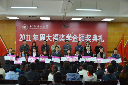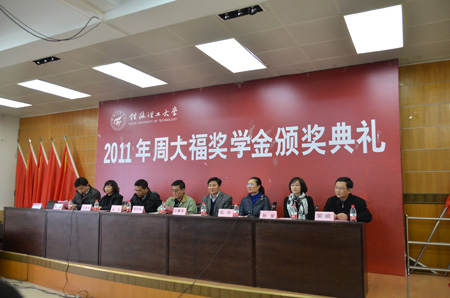 12月8日下午,我校2011年周大福奖学金颁奖典礼在学校党校教室举行。学校党委王赣华副书记参加颁奖典礼,学校校友办、学工处、招生就业处及地球科学学院、管理学院、人文社会科学学院相关负责人及辅导员参加颁奖仪式。周大福珠宝金行华南区域营运管理中心也专门派员参加颁奖典礼。 本年度学校共有30名优秀学子获得周大福奖学金,每生奖励5000元,奖金总额15万元。王赣华副书记在颁奖典礼上简要介绍了我校学生资助体系,并对周大福公司长期以来给予我校教育事业的大力支持表示感谢,同时希望双方今后在学生实习实训基地建设、人才培养等方面加强合作。王副书记也勉励获奖学生珍惜大学美好时光,阳光心态面对各种困难与挑战,努力成才,回报国家、学校培养,回报社会爱心人士的关心。 据悉,学校不断构建多元立体化学生资助体系,近年来广泛发掘资源,重视社会资助,在校已经设立周大福奖学金、80校友奖学金、桔灯奖学金等。