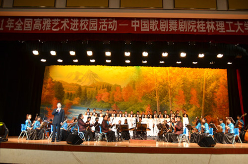 由教育部﹑文化部、财政部主办,广西壮族自治区教育厅承办的2011年高雅艺术进校园——中国歌剧舞剧院走进桂林理工大学专场演出于10月31日晚7点在我校屏风校区体育馆举行。中国歌剧舞剧院院长林文增、党委书记董天恒、副院长李小祥,我校党委副书记、纪委书记赵君,党委副书记王赣华,副校长陈学军、吴志强以及全校两千余名师生共同观看了演出。 学校党委王赣华副书记在演出开始前致辞,他代表全校师生感谢艺术家们不辞辛劳来到我校带来经典演出。他说,高雅艺术进校园活动,已经成为大学生了解艺术经典、接受艺术熏陶、提高艺术修养和艺术品位的有效途径,中国歌剧舞剧院的演出不仅让我们全校师生能够在校园里欣赏到高水平艺术团体的精彩演出,也为我校师生搭建了一个接触艺术、亲近艺术,提升艺术素养、感受艺术魅力的平台。随后,王副书记代表学校向中国歌剧舞剧院赠送礼物。 在国家一级指挥张峥先生热情奔放、充满活力的指挥下,欢快激扬的合唱《好日子》拉开了晚会的序幕,许多深受观众喜爱的中青年歌手纷纷登台献艺,激情四溢的演出令观众赏心悦目。整场演出荟萃了中外著名经典歌剧及经典歌曲,节目形式多样,内容丰富,异彩纷呈。既有《万泉河水清又清》等合唱,又有歌剧《珊瑚颂》、《图兰朵》等选段。还有民乐演奏《走马灯》、古筝独奏《渔舟唱晚》等让大家感受到中国民乐的独特魅力;新颖独特、极富青春气息的黑骑士组合带来的五重唱《游击队之歌》、《弹起我心爱的土琵琶》,《超级玛丽》、男声对唱《向天再借五百年》,海豚音独唱《歌剧2》、《忐忑》赢得了雷鸣般的掌声;青年男高音歌唱家李振涛演唱的《今夜无人入睡》将演出推向高潮。演出过程中,优秀主持人李小祥还与师生们进行了现场互动,使大家了解了很多音乐知识。演出在合唱《二十年后再相会》中画下了完美句号。精彩的表演让现场掌声不断,高潮迭起,气氛异常活跃。 中国歌剧舞剧院始建于1952年,是隶属国家文化部的国家级剧院。拥有歌剧团、舞剧团、民族乐团、管弦乐团、创作室及一个完整的舞台美术制作部。建院半个多世纪以来,剧院先后排练和演出了近百部著名歌剧和舞剧,如:歌剧《白毛女》、《窦娥冤》、《原野》,舞剧《红楼梦》、《铜雀伎》、《篱笆墙的影子》等。近年来,推出了《花木兰》等一批优秀音乐剧,出色完成了大型音乐舞蹈史诗《东方红》、亚运会、国际艺术节、国际合唱节以及接待外国元首(如美国前总统克林顿)访华等创作演出任务。 2011年“高雅艺术进校园”桂林理工大学专场演出活动提升了我校师生的艺术素养,陶冶了师生情操,让我校广大师生享受了一场艺术盛宴,在党的十七届六中全会提出促进社会主义文化事业大发展大繁荣的背景下,对促进我校校园文化建设具有积极意义。