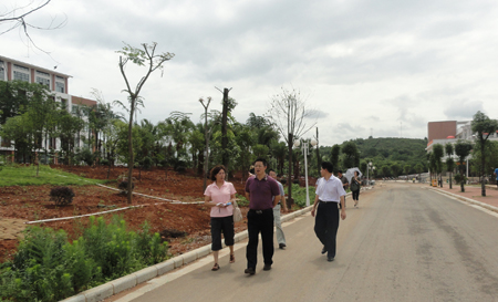 6月27日上午,张学洪校长在副校长陈贵英、党(校)办主任莫珂的陪同下,现场考察了雁山校区绿化建设进展情况,对雁山校区校园植树绿化景观进行了实地察看。 张校长认真听取了校基建处、后勤管理处负责人的有关雁山校区绿化建设情况的工作汇报,重点对科技综合楼周边的绿化养护、植物生长状态等情况进行了察看了解。他充分肯定了雁山校区校园绿化工作所取得的成绩,并对下一步做好雁山校园植物绿化景点的设计和花草树木的拟种植品种等工作提出了具体意见和要求,希望各有关部门要相互配合,抓紧时间,继续优化校园绿化美化规划方案,确保校园绿化美化工作保质保量完成;打造出环境优美、景色宜人的绿色校园,为广大师生营造更加优美的学习生活环境。