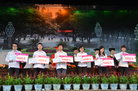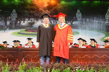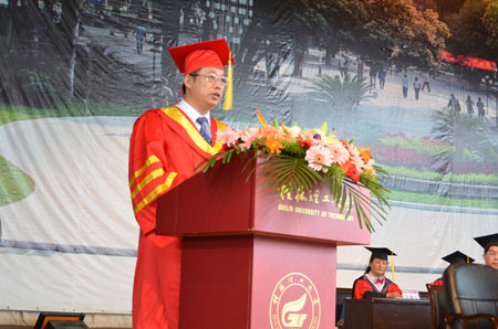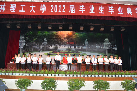 6月22日上午,我校2012届毕业生毕业典礼暨学位授予仪式在体育馆三楼隆重举行。学校党委副书记、校长、校学位评定委员会主席张学洪;党委副书记、纪委书记赵君;党委副书记王赣华;副校长肖岳峰、陈学军、吴志强、陈贵英、刘宝臣,正厅级调研员张鹏等在校校领导及校学位评定委员会成员身着导师服出席毕业典礼暨学位授予仪式。毕业典礼暨学位授予仪式由王赣华副书记主持。 赵君副书记宣读了2012年度全区普通高等教育优秀大学毕业生表彰决定、2012年度学校优秀大学毕业生表彰决定、2012年大学生志愿服务西部计划志愿者表彰决定。在主席台前排就坐的校领导和有关职能部门负责人为区级、校级优秀大学毕业生代表和2011年大学生志愿服务西部计划学生颁发了荣誉证书和奖金。 校学位评定委员会副主席、副校长吴志强教授宣读了2012届毕业生毕业资格、学位授予情况审查报告。 信息科学与工程学院电子信息工程08-2班蒙国强同学代表2012届毕业生发言,表达了对母校、师长的感恩之情和在新的人生征途中奋发努力、报效祖国、服务人民、为母校争光的决心。环境科学与工程学院院长王敦球教授代表学校教师发言,对2012届毕业生寄予殷殷希冀和真诚祝福。 张学洪校长代表学校党委、行政向全体毕业生致以热烈的祝贺,并向为同学们的成长倾注无数心血和汗水的老师们表示深深的敬意和衷心的感谢。他说,几年前,同学们怀揣着对知识的渴望和对人生的追求,从全国各地来到山水甲天下的桂林,来到美丽的雁山、屏风山脚下,在桂工的校园里度过了你们人生成长过程中最为灿烂的流金岁月。同学们心系民族、胸怀祖国、情牵母校,在上海世博会的成功举办中激发了骄傲和自豪;在与汶川、玉树地震的抗争中学会了真爱和大爱;在神九天宫交汇对接中增强了民族自信心和自豪感;在“小悦悦事件”中抒发着对冷漠的愤慨、呼唤道德的回归;在温州动车事故中学会了责任的担当;在乔布斯的离去中感受着时代的传奇;在支持雁山校区建设中学会了理解与宽容;在为学校“更名”、“申博”奋斗中学会了承担责任与义务,等等……他深情嘱咐毕业生们,踏上新的人生征程,要勇于面对社会挑战,敢于担当社会责任;积极践行“桂工精神”,时刻保持远大理想;树立终身学习观念,提高自身综合素养;诚实守信立世做人,谦虚谨慎立行做事。最后,他希望广大毕业生在离开学校之后,无论身在何方、业立何处,都能永葆母校赋予的优秀品质,以良好的精神状态和突出的业绩为母校增光添彩,大家的成功就是母校的骄傲,就是桂工的至高荣誉。母校永远是广大毕业生的坚强后盾,永远是广大毕业生温暖的家!欢迎同学们常回家看看! 最后,校学位评定委员会主席、学校校长张学洪教授为2012届毕业生代表颁发学位证书,并与毕业生代表一一合影,留下这庄严而难忘的时刻。